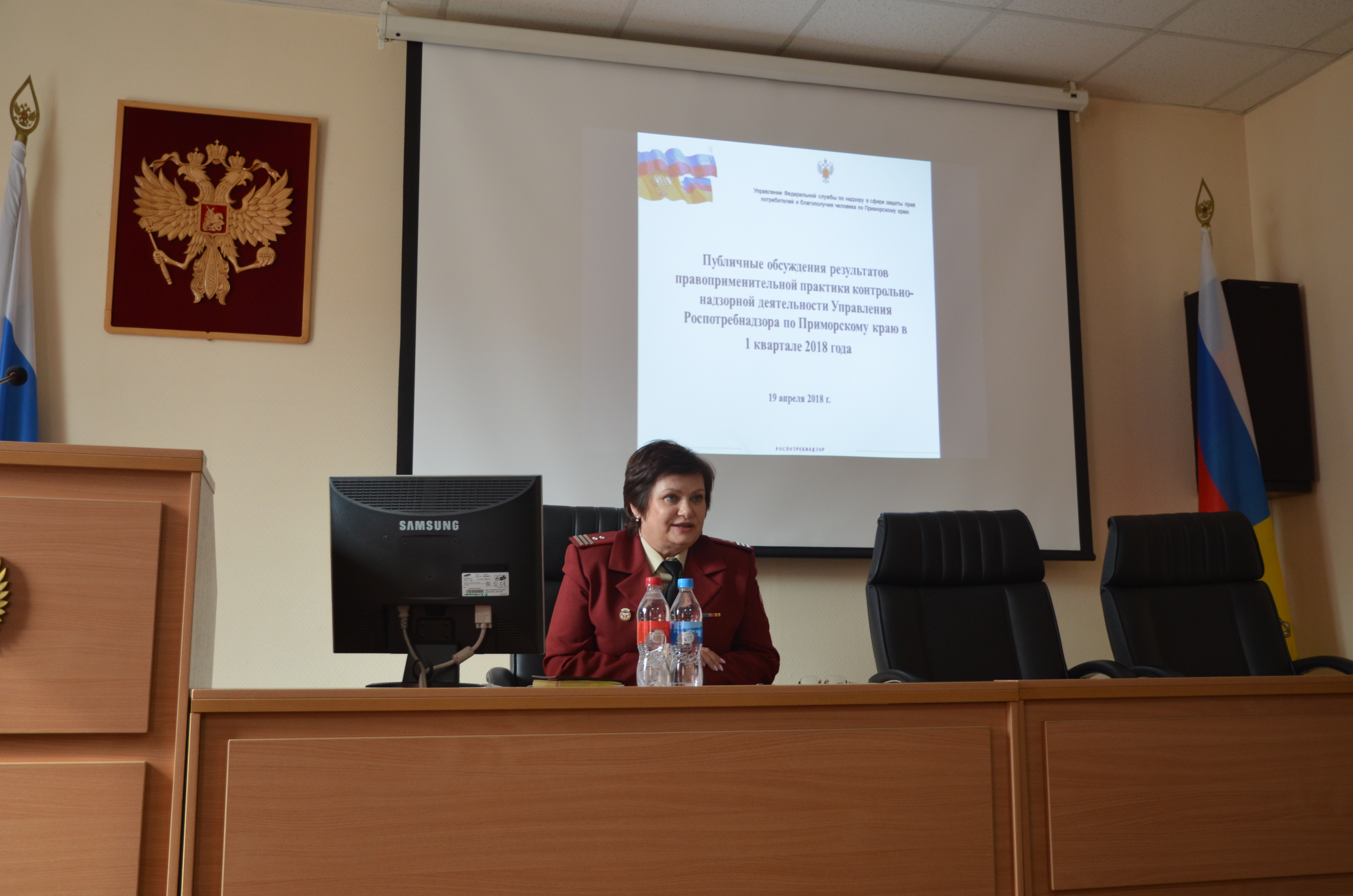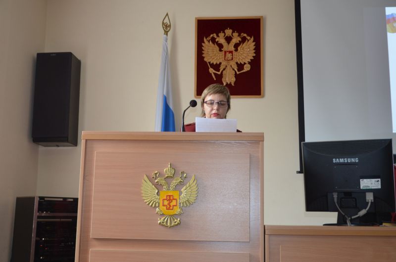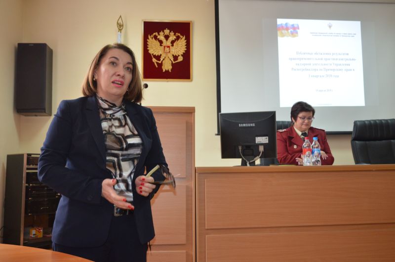 На совещании с докладом «О результатах контрольно-надзорной деятельности Управления Роспотребнадзора по Приморскому краю за 1 кв. 2018г.» выступила врио руководителя Управления Роспотребнадзора по Приморскому краю Полякова М.В.