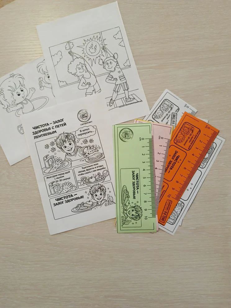 В завершение встречи прозвучали пять важных правил гигиены от Пети Лентяева, а затем все посмотрели любимые мультики "Смешарики" – серии "Личная гигиена" и "Зарядка". На память о полезном дне каждый ребенок получил раскраски с Петей Лентяевым и яркие линеечки.
