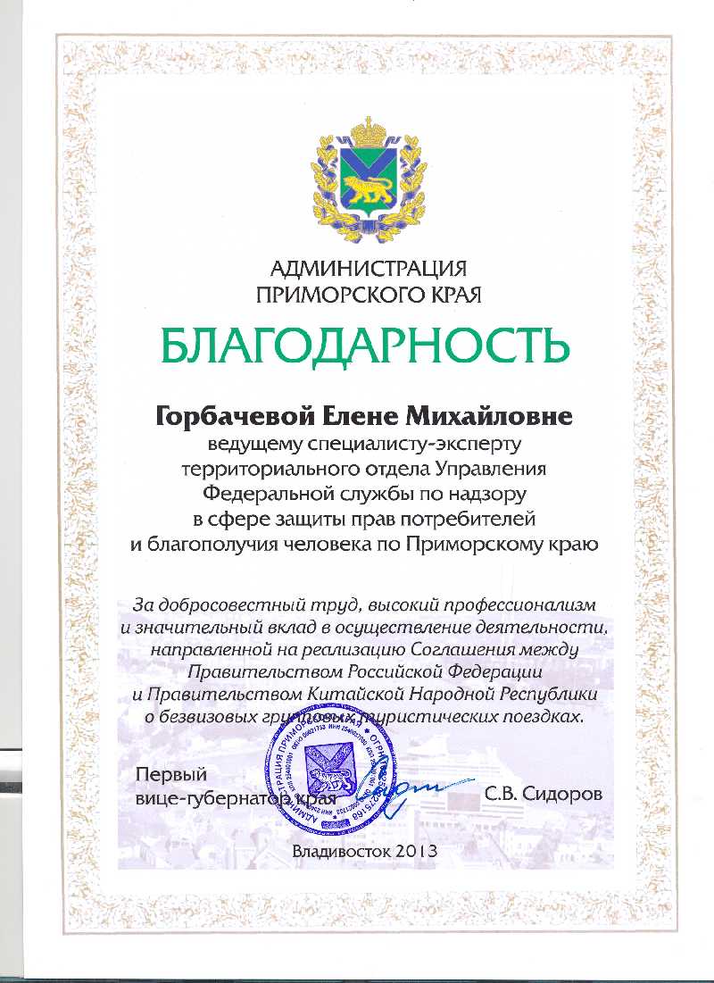 Благодарность вручена Горбачевой Елене Михайловне ведущему специалисту-эксперту территориального отдела Управления Федеральной службы по надзору в сфере защиты прав потребителей и благополучия человека по Приморскому краю (пункт пропуска «Сосновая Падь», п. Пограничный).