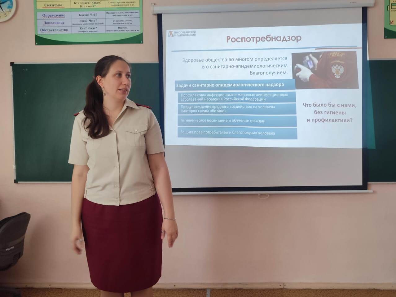 Старшеклассникам рассказали о медицинском университете нашего края - ФГБОУ ВО ТГМУ Минздрава России, презентовали фильм, созданный студентами, специальности «медико-профилактическое дело» Тихоокеанского государственного медицинского университета. Поговорили о рабочих буднях врачей эпидемиологов и гигиенистов, профессиональная деятельность которых сконцентрирована на охране здоровья людей, обеспечении их благополучия и безопасности. В беседе было обращено внимание на преимущества учебы в ВУЗах по целевому направлению.