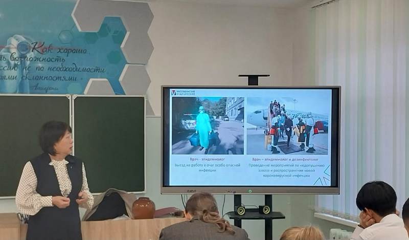 Школьников познакомили со структурой Роспотребнадзора, основными целями и задачами санитарно-эпидемиологической службы. Знакомство с профессией позволило учащимся получить представление об одной из самых сложных, важных и востребованных профессий. Ребята с интересом познакомились с презентацией о специалистах медико-профилактического профиля в системе Роспотребнадзора, узнали об одном из важнейших направлений здравоохранения – медицине профилактической.